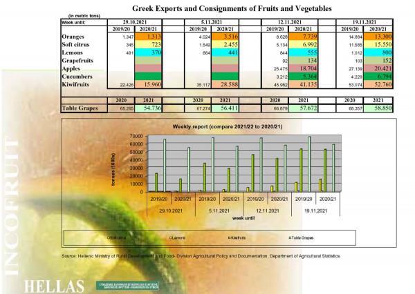 Επίσης, από 1/9/2021 έως και 19/11/2021 οι αναγγελίες φορτίων καταχωρήθηκαν στο ΜΕΝΟ για εξαγωγή-διακίνηση ακτινιδίων 52.760 τόνων εκ των οποίων προς Ιταλία κατευθύνθηκαν 29.053 τόνοι (το 55% των εξαγωγών τους).