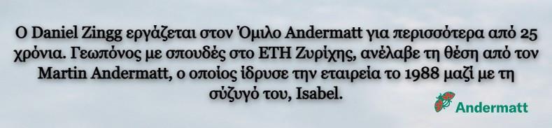D.Zingg: Καθώς ο κλάδος των βιολογικών συγκεντρώνεται, η ανεξαρτησία είναι καθοριστικής σημασίας για την Andermatt. Η ανεξαρτησία μάς επιτρέπει να λαμβάνουμε έξυπνες, μακροπρόθεσμες αποφάσεις, να προστατεύουμε την επιστημονική μας κουλτούρα και να αξιοποιούμε τις πολλαπλές δυνάμεις που διαθέτουμε σε όλο τον Όμιλο. Θα συνεχίσουμε να καινοτομούμε με ακεραιότητα και να παραμένουμε πιστοί σε αυτό που είμαστε, ένας ανεξάρτητος, προσανατολισμένος στην αποστολή του, παγκόσμιος ηγέτης στις βιολογικές λύσεις.