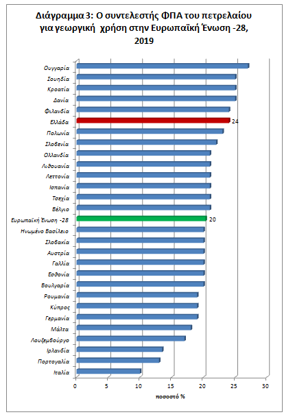 Στο Διάγραμμα 3 παρουσιάζεται ο συντελεστής του ΦΠΑ πετρελαίου για γεωργική χρήση για το έτος 2019. Οι χώρες με το μεγαλύτερο συντελεστή είναι η Ουγγαρία (27%), η Σουηδία, η Κροατία & η Δανία (25%) και η Φιλανδία με την Ελλάδα (24%). Οι χώρες με το μικρότερο συντελεστή είναι η Ιταλία (10%), η Πορτογαλία (13%) και η Ιρλανδία (13,5%). Ο συντελεστής ΦΠΑ για την ΕΕ-28 είναι 20%.