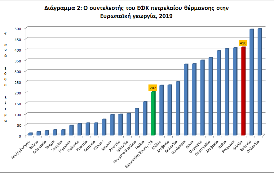 Στο Διάγραμμα 2 παρουσιάζεται ο συντελεστής του ΕΦΚ πετρελαίου θέρμανσης για επιχειρηματική χρήση για το έτος 2019. Οι χώρες με το μεγαλύτερο συντελεστή είναι η Ολλανδία (496 €/1000 λίτρα), η Εσθονία (493 €/1000 λίτρα ) και η Ελλάδα (410 €/1000 λίτρα). Οι χώρες με το μικρότερο συντελεστή είναι το Λουξεμβούργο (10 €/1000 λίτρα), το Βέλγιο (17 €/1000 λίτρα) και η Λιθουανία (21 €/1000 λίτρα). Ο συντελεστής στην ΕΕ-28 είναι 202 €/1000 λίτρα πετρελαίου θέρμανσης.