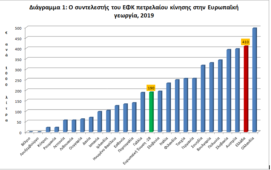 Στο Διάγραμμα 1 παρουσιάζεται ο συντελεστής του ΕΦΚ πετρελαίου κίνησης για γεωργική χρήση για το έτος 2019. Οι χώρες με το μεγαλύτερο συντελεστή είναι η Ολλανδία (496 €/1000 λίτρα), η Ελλάδα (410 €/1000 λίτρα) και η Αυστρία (397 €/1000 λίτρα). Οι χώρες με το μικρότερο συντελεστή είναι το Βέλγιο (0 €/1000 λίτρα), το Λουξεμβούργο (0 €/1000 λίτρα) και η Κύπρος (21 €/1000 λίτρα). Ο συντελεστής στην ΕΕ-28 είναι 190 €/1000 λίτρα πετρελαίου κίνησης.