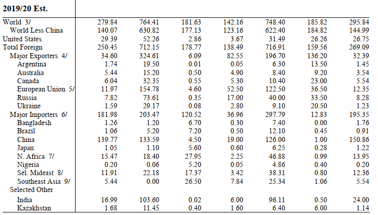 Οι προβλεπόμενες παγκόσμιες εξαγωγές 2020/21 αυξάνονται 0,9 εκατομμύρια τόνους σε 188,9 εκατομμύρια, με αποτέλεσμα αύξηση 2,0 εκατομμυρίων τόνων για την Αυστραλία σε μεγαλύτερες προμήθειες και αύξηση 1,0 εκατομμυρίων για τη Ρωσία λόγω του μειωμένου ανταγωνισμού από την Ουκρανία. Οι εξαγωγές μειώθηκαν 1,5 εκατομμύρια τόνοι για την Ουκρανία και 0,5 εκατομμύρια για την ΕΕ, και οι δύο σε μικρότερες καλλιέργειες. Με την αύξηση του εφοδιασμού και την παγκόσμια χρήση να μειώνεται κλασματικά, οι παγκόσμιες μετοχές αυξάνονται 6,0 εκατομμύρια τόνους σε ρεκόρ ύψους 316,1 εκατομμύρια, με την Κίνα και την Ινδία να αντιπροσωπεύουν το 51% και το 10% του συνόλου, αντίστοιχα.