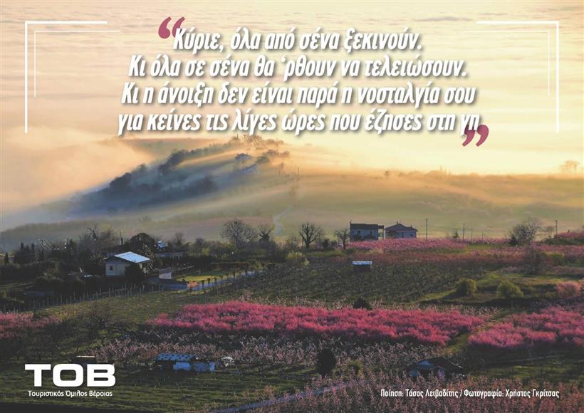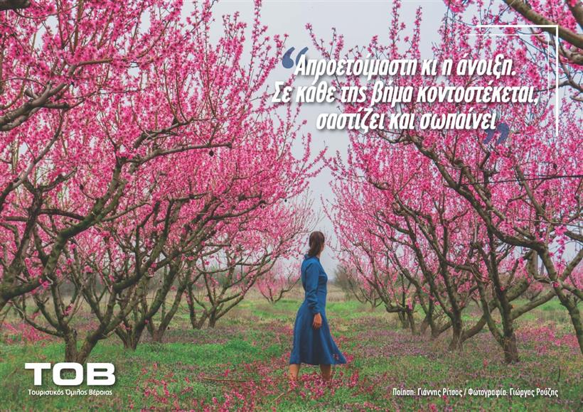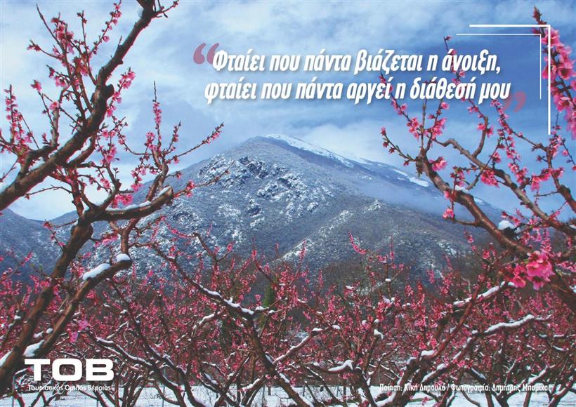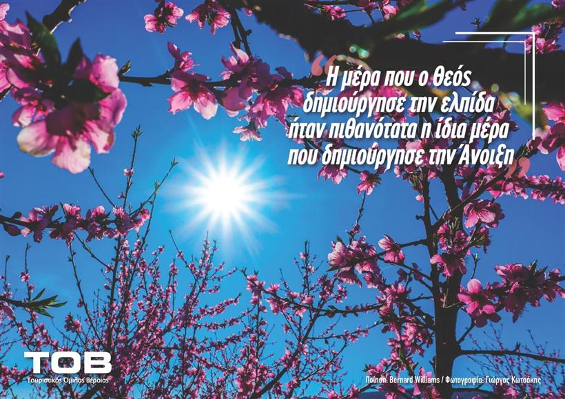 Σε μία χρονική περίοδο που η ζοφερή πραγματικότητα και τα δυσάρεστα γεγονότα περισσεύουν, η Βέροια έχει ένα μοναδικό προνόμιο να ζει κάθε άνοιξη τη δική της Αναγέννηση! Οι Ανθισμένες Ροδακινιές αψηφούν την πανδημία και καλωσορίζουν την Άνοιξη, στέλνοντας ένα αισιόδοξο μήνυμα προς όλους μας!