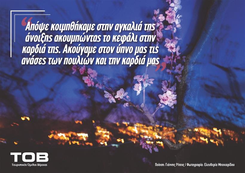 Παράλληλα, μέσω της σελίδας του ΤΟΒ στα socialmedia, απαντάμε στην κατήφεια του εγκλεισμού με φωτογραφία και ποίηση. Φωτογραφίες που διακρίθηκαν στους διαγωνισμούς φωτογραφίας με θέμα τις Ανθισμένες Ροδακινιές «ντύνονται» με στίχους αγαπημένων ποιητών, αλλά και με τα χαρακτηριστικά γιαπωνέζικα χαϊκού.