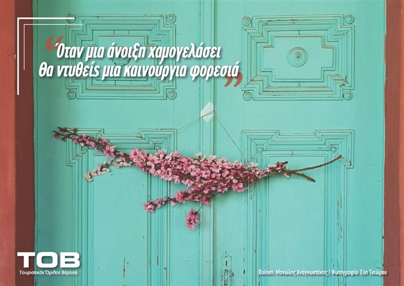 Η αφίσα είναι γεμάτη συμβολισμούς και αποτυπώνει με γλαφυρό τρόπο τα ανάμεικτα συναισθήματα της φετινής άνοιξης: την κλειστή πόρτα της ζωής μας λόγω πανδημίας σε αντιδιαστολή με το ανοιχτό, ανθισμένο κλαδί της ροδακινιάς. Η φωτογραφία της Εύης Τσιώμου, από τον περσινό διαγωνισμό φωτογραφίας του ΤΟΒ, συνδυάζεται με την ποίηση του Μανώλη Αναγνωστάκη με στόχο να προβληματίσει, να εκφράσει και να τονώσει το ηθικό του εμπορικού κόσμου και των συμπολιτών μας.