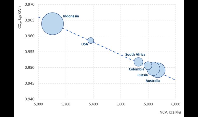 Σε κάποιο βαθμό, φαίνεται περίεργο ότι οι εκπομπές CO2 ανά μονάδα παραγόμενης ενέργειας μειώνονται με τη μετάβαση από άνθρακα χαμηλής ποιότητας με σχετικά χαμηλή περιεκτικότητα σταθερού άνθρακα σε άνθρακα υψηλής ποιότητας με υψηλότερη περιεκτικότητα σταθερού άνθρακα. Αυτό εξηγείται από το γεγονός ότι η θερμογόνος δύναμη του άνθρακα αυξάνεται με την αύξηση της περιεκτικότητάς του σε άνθρακα. Αυτό σημαίνει ότι για να παράγει κανείς την ίδια ποσότητα ενέργειας, πρέπει να καίει λιγότερο άνθρακα υψηλής θερμιδικής αξίας από άνθρακα χαμηλής θερμιδικής αξίας. Αυτός ο κανόνας παραβιάζεται μόνο κατά τη μετάβαση από ασφαλτούχους άνθρακα χαμηλής πτητικότητας στον ανθρακίτη, όπου η αύξηση της περιεκτικότητας σε άνθρακα δεν οδηγεί σε αύξηση της θερμογόνου δύναμης. Κατά συνέπεια, οι εκπομπές CO2 ανά μονάδα παραγόμενης ενέργειας αρχίζουν να αυξάνονται.