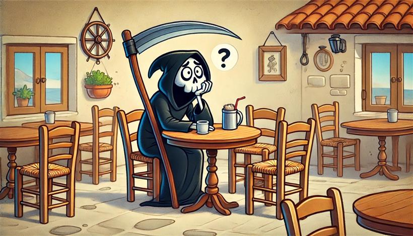 Ήταν ένα ηλιόλουστο μεσημέρι σε ένα καφενείο στο χωριό, όταν ο Μήτσος ο αγρότης είδε έναν παράξενο τύπο να κάθεται μόνος του σε μια γωνιά. Ψηλός, λιγνός, με μαύρο ράσο και μια δρεπάνη ακουμπισμένη δίπλα του. «Ποιος να 'ναι αυτός;» σκέφτηκε.