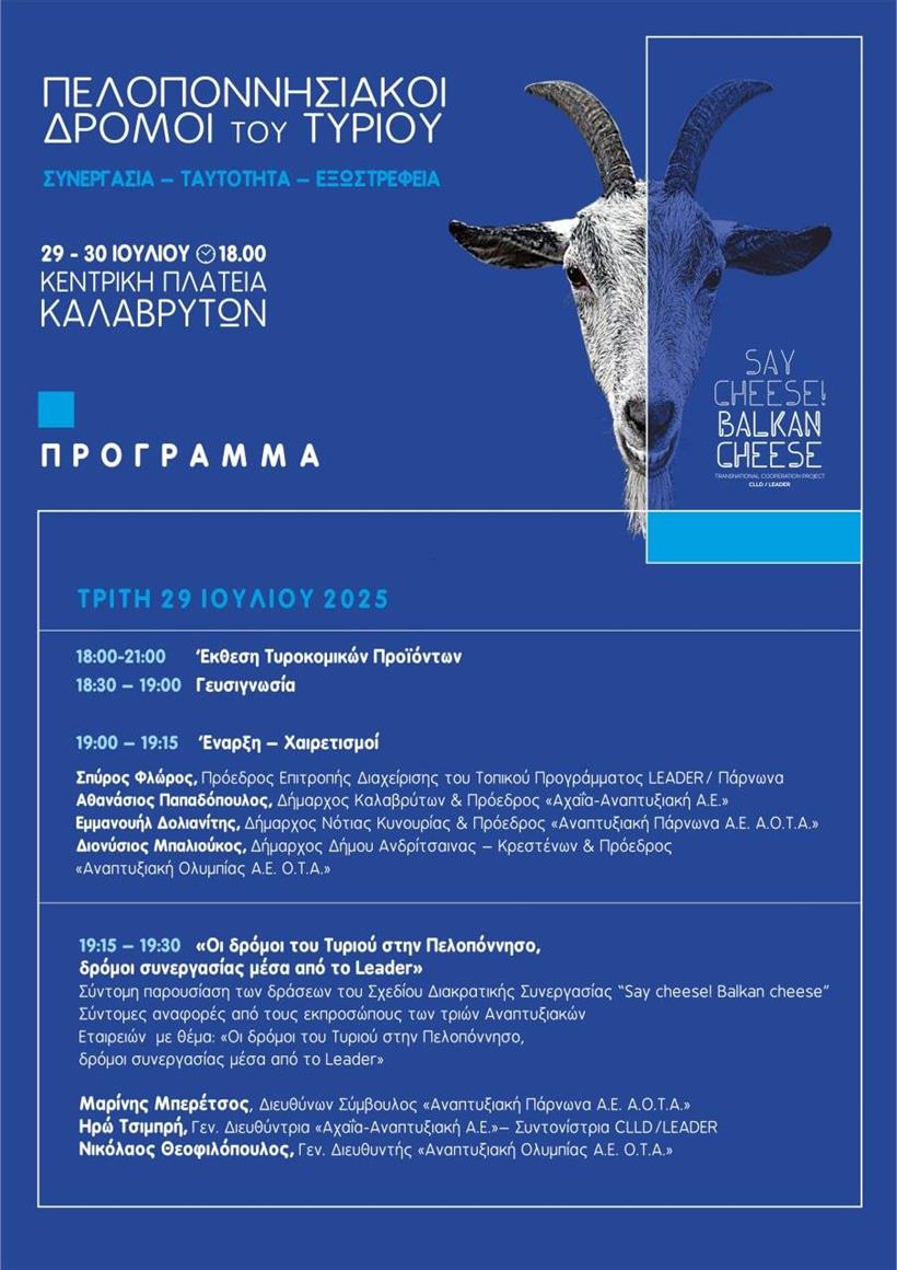 Δευτέρα και Τρίτη 28 -29 Ιουλίου θα πραγματοποιηθούν στα Καλάβρυτα δράσεις με θέμα «Πελοποννησιακοί δρόμοι του Τυριού | Συνεργασία –Ταυτότητα – Εξωστρέφεια».