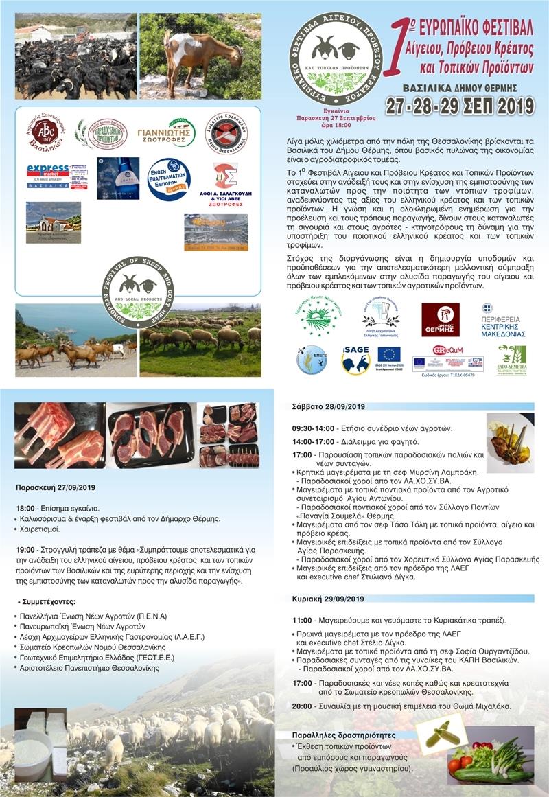 Το 1ο Ευρωπαϊκό Φεστιβάλ Αίγειου και Πρόβειου Κρέατος και Τοπικών Προϊόντων διοργανώνεται στα Βασιλικά του Δήμου Θέρμης, από τις 27 έως τις 29 Σεπτεμβρίου 2019, από το Δήμο Θέρμης, τη Λέσχη Αρχιμαγείρων Ελληνικής Γαστρονομίας και την Πανελλήνια Ένωση Νέων Αγροτών, υπό την αιγίδα της Περιφέρειας Κεντρικής Μακεδονίας και τη συνεργασία του Εργαστηρίου Ζωοτεχνίας του Τμήματος Κτηνιατρικής της Σχολής Επιστημών Υγείας του Αριστοτέλειου Πανεπιστημίου Θεσσαλονίκης.