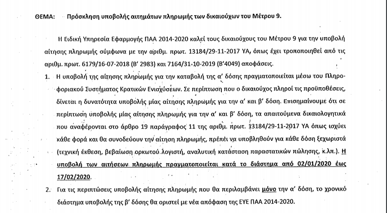 Πρόσκληση υποβολής αιτημάτων πληρωμής των δικαιούχων του Μέτρου 9