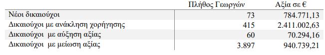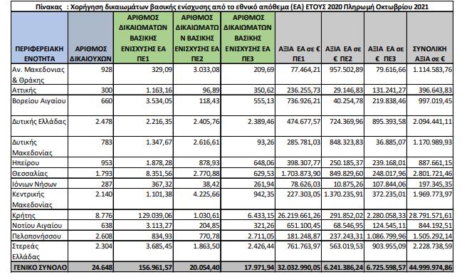 Σας ενημερώνουμε ότι σε συνέχεια της χορήγησης δικαιωμάτων βασικής ενίσχυσης από το εθνικό απόθεμα 2020 τον Δεκέμβριο του 2020 και τον Ιούνιο του 2021, πραγματοποιήθηκε την 01-10-2021 επεξεργασία χορήγησης δικαιωμάτων από το εθνικό απόθεμα 2020 κατόπιν της ολοκλήρωσης των ειδικών διοικητικών ελέγχων και το κλείσιμο του οικονομικού έτους. Η επεξεργασία χορήγησης με ημερομηνία 01-10-2021 απεικονίζεται στον κάτωθι πίνακα: