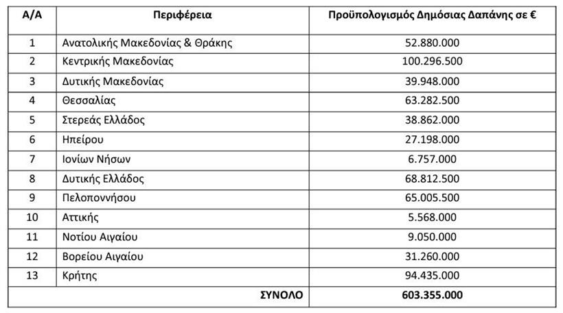 Για την εφαρμογή της, κατανέμονται σε βάρος του υπομέτρου 6.1 του ΠΑΑ 2014–2020 τα εξής ποσά ανά Περιφέρεια:
