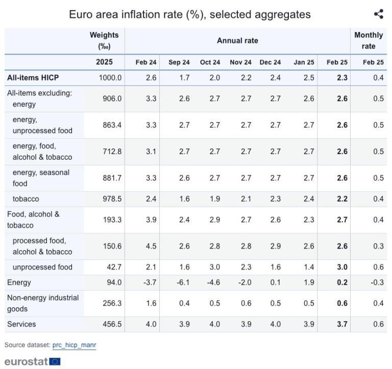 Ο πληθωρισμός της Ευρωζώνης διαμορφώθηκε στο 2,3% τον Φεβρουάριο, μειωμένος κατά δύο δέκατα της ποσοστιαίας μονάδας από το 2,5% του Ιανουαρίου και κάτω από το αναμενόμενο 2,4%, χάρη στην ενέργεια, η αύξηση της οποίας ήταν πολύ χαμηλότερη από τον προηγούμενο μήνα, σύμφωνα με τα στοιχεία της Eurostat, της στατιστικής υπηρεσίας της Ευρωπαϊκής Ένωσης (ΕΕ).