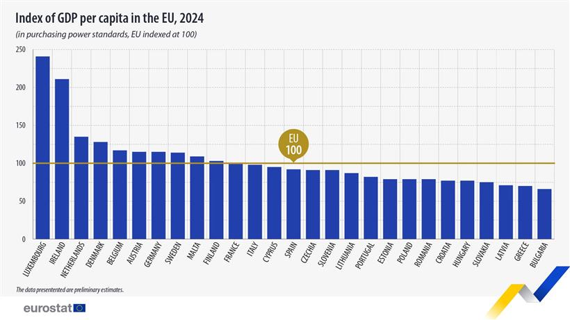 Η ανάλυση των στοιχείων αποκαλύπτει σημαντικές διαφορές μεταξύ των κρατών-μελών. Δέκα χώρες της ΕΕ κατέγραψαν κατά κεφαλήν ΑΕΠ πάνω από τον μέσο όρο, με το Λουξεμβούργο (241%) και την Ιρλανδία (211%) να βρίσκονται στην κορυφή της κατάταξης. Ακολουθούν οι Κάτω Χώρες (135%), η Δανία (128%) και το Βέλγιο (117%).