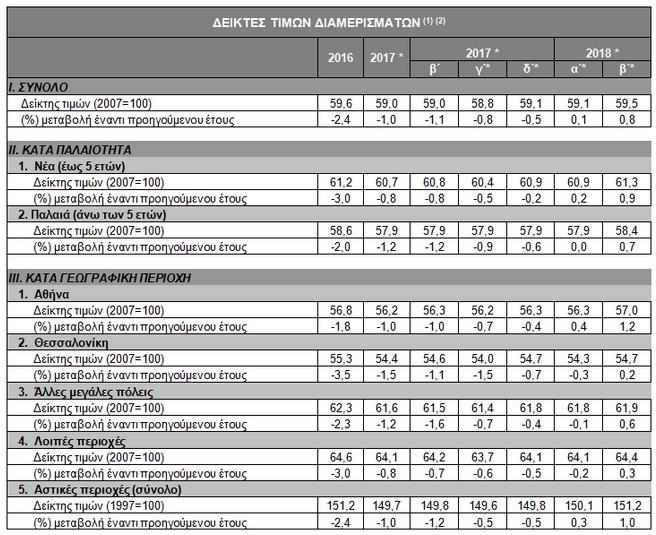 Πιο αναλυτικά, η αύξηση των τιμών το β΄ τρίμηνο του 2018 σε σχέση με το αντίστοιχο τρίμηνο του 2017 ήταν 0,9% για τα «νέα» διαμερίσματα, δηλ. ηλικίας έως 5 ετών, και 0,7% για τα «παλαιά», δηλ. ηλικίας άνω των 5 ετών. Με βάση τα αναθεωρημένα στοιχεία, το α΄ τρίμηνο του 2018, σημειώθηκε οριακή αύξηση των τιμών των «νέων» διαμερισμάτων κατά 0,2%, ενώ οι τιμές των «παλαιών» διαμερισμάτων παρέμειναν αμετάβλητες σε σύγκριση με το αντίστοιχο τρίμηνο του 2017. Για το σύνολο του 2017, οι τιμές μειώθηκαν με μέσο ετήσιο ρυθμό 0,8% και 1,2% για τα «νέα» και τα «παλαιά» διαμερίσματα αντίστοιχα.