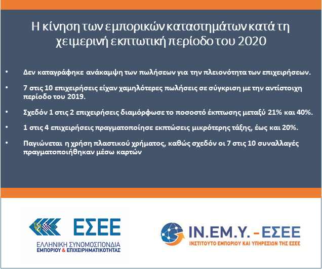 - Τα αποτελέσματα των χειμερινών εκπτώσεων 2020 δεν διαφοροποιούνται ουσιαστικά σε σχέση με την αντίστοιχη περυσινή περίοδο, δεδομένου ότι δεν καταγράφηκε ανάκαμψη των πωλήσεων για την πλειονότητα των επιχειρήσεων. Συγκεκριμένα, για τις 7 στις 10 επιχειρήσεις οι πωλήσεις ήταν χαμηλότερες σε σύγκριση με την αντίστοιχη περίοδο του 2019, ενώ για το 24% των επιχειρήσεων παρέμειναν σταθερές και μόνο για το 7% κινήθηκαν σε καλύτερα επίπεδα.