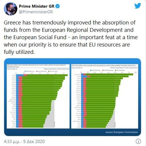 Την εντυπωσιακή βελτίωση του ποσοστού απορρόφησης των ευρωπαϊκών κονδυλίων χαιρέτισε ο πρωθυπουργός, Κυριάκος Μητσοτάκης, σε ανάρτησή του στο Twitter.