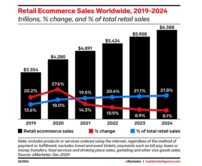 Το 2020 εκτιμάται ότι η αξία των λιανικών ηλεκτρονικών πωλήσεων διευρύνθηκε κατά 27,6% και υπερέβη τα $4,28 τρισ. Η επίδοση αυτή διέψευσε τις αρχικές εκτιμήσεις των αναλυτών, που ήθελαν τον ρυθμό ανάπτυξης του παγκόσμιου e-commerce να επιβραδύνεται και να κινείται στα επίπεδα του 16,5% ελέω πανδημίας.