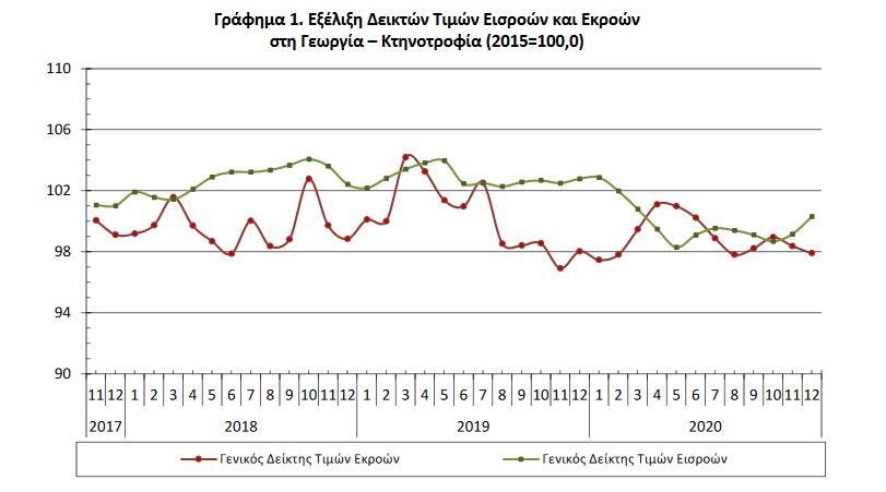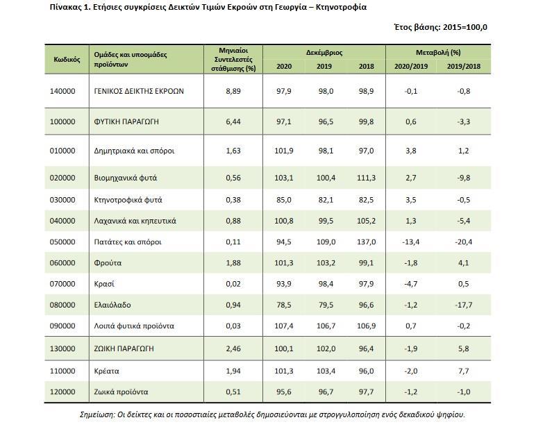 Ο Γενικός Δείκτης Τιμών Εκροών στη γεωργία – κτηνοτροφία (χωρίς επιδοτήσεις) του μηνός Δεκεμβρίου 2020, σε σύγκριση με τον αντίστοιχο δείκτη του Δεκεμβρίου 2019, παρουσίασε μείωση 0,1%. Ο αντίστοιχος δείκτης του Δεκεμβρίου 2019, σε σύγκριση με το Δεκέμβριο 2018, είχε παρουσιάσει μείωση 0,8%.