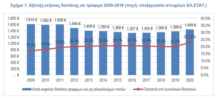 Παρά την αύξηση αυτή, διαχρονικά την τελευταία 10ετία 2009-2020 η δαπάνη των νοικοκυρών σε ήδη τροφίμων και μη αλκοολούχων ποτών έχει μειωθεί κατά -10,28% (βλ. σχήμα 1). Βέβαια, την 4ετία (2016-2019) η κατά κεφαλήν δαπάνη των νοικοκυριών σε τρόφιμα και μη αλκοολούχα ποτά παρουσίαζε αύξηση από 1.337 ευρώ κατά κεφαλήν το 2016 σε 1.388 ευρώ το 2019, μεταβολή 3,83%, στην οποία ήρθε να προστεθεί η αύξηση του 2020 στα 1.449 ευρώ και συνολική αύξηση 8,36%, η οποία ολοκληρώθηκε σε ένα περιβάλλον σταθερών τιμών, καθώς ο δείκτης τιμών καταναλωτή από το 2016 ως το 2020, παρέμεινε πρακτικά αμετάβλητος σε βάθος 5ετίας.
