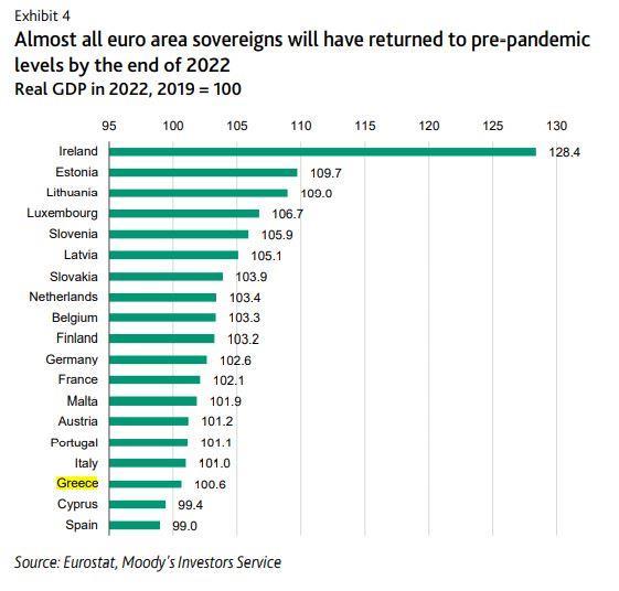 Έτσι, η ελληνική οικονομία (όπως και οι περισσότερες της Ευρωζώνης) θα έχει καλύψει το χαμένο έδαφος του κορωνοϊού, με το πραγματικό ΑΕΠ να διαμορφώνεται το 2022 στο 100,6% των επιπέδων του 2019. Σύμφωνα με τους υπολογισμούς της Moody’s, η οικονομία της Ευρωζώνης συνολικά θα είναι το 2022 κατά 2,7% μεγαλύτερη από τα προ-πανδημίας επίπεδα, με τις πιο οριακές επιδόσεις της Ελλάδας να αποδίδονται στη μεγάλη εξάρτηση της χώρας από τον τουρισμό.