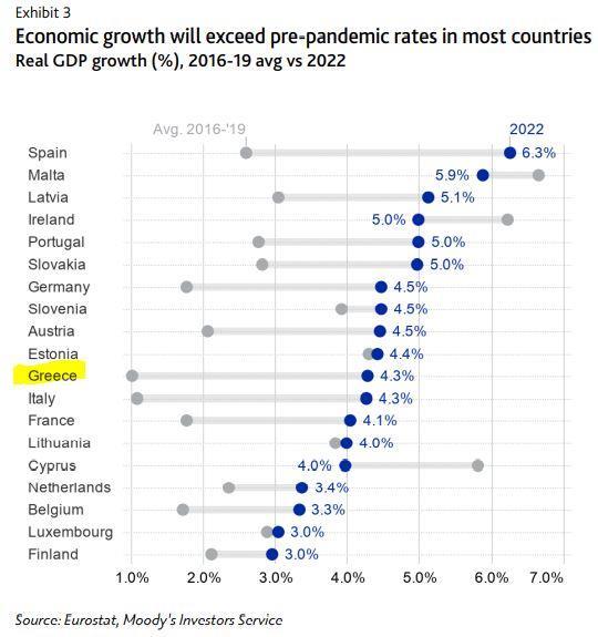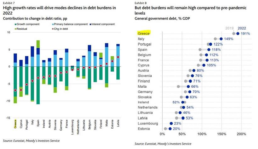 Σύμφωνα με τις εκτιμήσεις της Moody’s, η ελληνική οικονομία θα εμφανίσει ανάπτυξη 4,3% το 2022, ενώ το ελληνικό χρέος θα μειωθεί κατά 10,1 ποσοστιαίες μονάδες –περισσότερο από όλες τις άλλες χώρες της Ευρωζώνης- για να διαμορφωθεί στο 191% του ΑΕΠ.