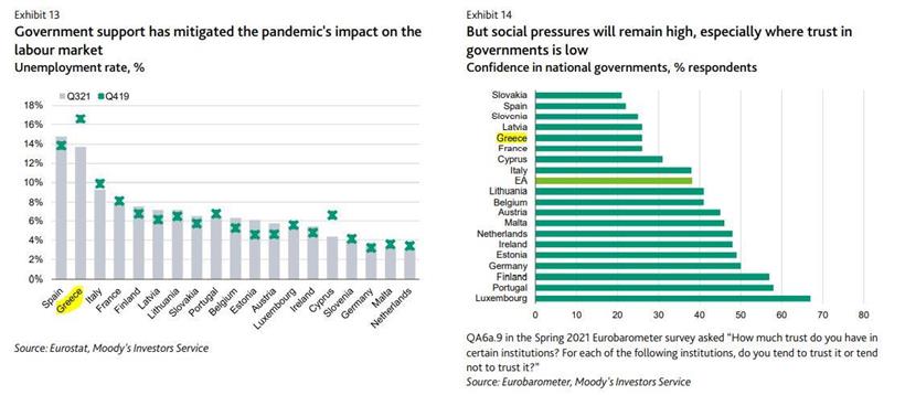 Επομένως, η απαίτηση για κοινωνικές υπηρεσίες θα είναι έντονη στη μετα-πανδημική φάση, καθώς οι σχετικές πιέσεις εντείνονται από τη γήρανση των πληθυσμών. Χώρες όπου η εμπιστοσύνη στις κυβερνήσεις είναι χαμηλή, όπως στη Γαλλία, την Ισπανία, την Ελλάδα, τη Σλοβακία και τη Σλοβενία, εκτιμάται ότι κινδυνεύουν περισσότερο από τις κοινωνικές εντάσεις. Και η Moody’s τονίζει ότι οι κοινωνικές απαιτήσεις έρχονται σε σύγκρουση με τους στόχους των κυβερνήσεων για δημοσιονομική προσαρμογή.