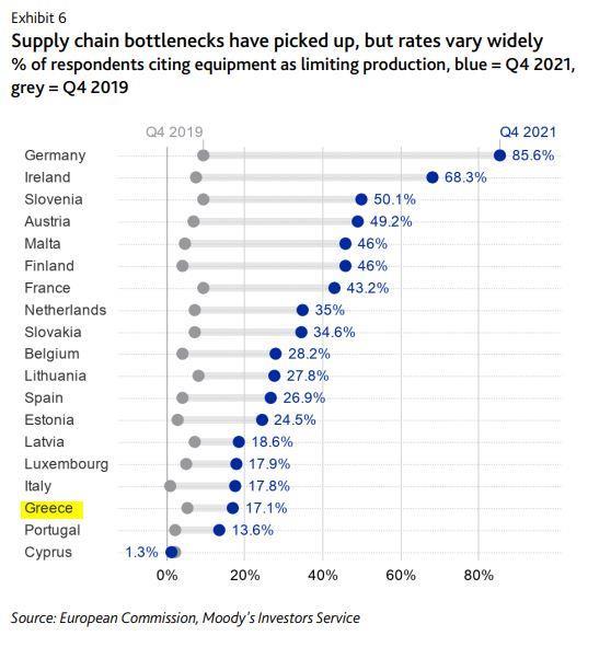 Η Moody’s προβλέπει ότι οι πληθωριστικές πιέσεις θα μετριαστούν μόλις αρχίσουν να εξομαλύνονται οι δυσκολίες στις αλυσίδες παραγωγής, το 2022. Άλλωστε, από τα στοιχεία του οίκου φαίνεται ότι τα προβλήματα στην εφοδιαστική αλυσίδα επηρεάζουν ελάχιστα οικονομίες όπως είναι η ελληνική. Με την αύξηση του πληθωρισμού να θεωρείται προσωρινή, η Moody’s περιμένει ότι η ΕΚΤ θα διατηρήσει τα επιτόκιά της σταθερά και καθ’ όλο το 2023.