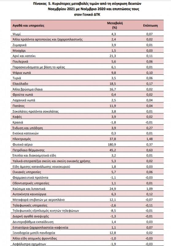 Οπως προκύπτει από τα στοιχεία της ΕΛΣΤΑΤ, μέσα σε έναν μήνα (Νοέμβριο από Οκτώβριο 2021) ο τιμάριθμος ενισχύθηκε κατά 0,5%, με τις κυριότερες αυξήσεις τιμών να αφορούν: φυσικό αέριο (31,7%), ηλεκτρισμό (15,9%), φρούτα νωπά (3,5%), πατάτες (3,2%), αρνί και κατσίκι (2,9%), χοιρινό (2,1%). Αλλα προϊόντα αρτοποιίας και ζαχαροπλαστικής (2,1%), τυριά (2,1%), λαχανικά διατηρημένα ή επεξεργασμένα (1,7%), καύσιμα και λιπαντικά (1,6%), αυτοκίνητα καινούργια (1,3%), πουλερικά (1,2%), ψάρια νωπά (1,1%) και μοσχάρι (0,7%).