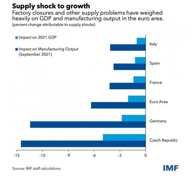 Τον μεγάλο αντίκτυπο που έχουν τα προβλήματα στην εφοδιαστική αλυσίδα στην αύξηση του ΑΕΠ και τον πληθωρισμό στην Ευρωζώνη αναδεικνύει μελέτη του Διεθνούς Νομισματικού Ταμείου (ΔΝΤ) που δόθηκε σήμερα στη δημοσιότητα.