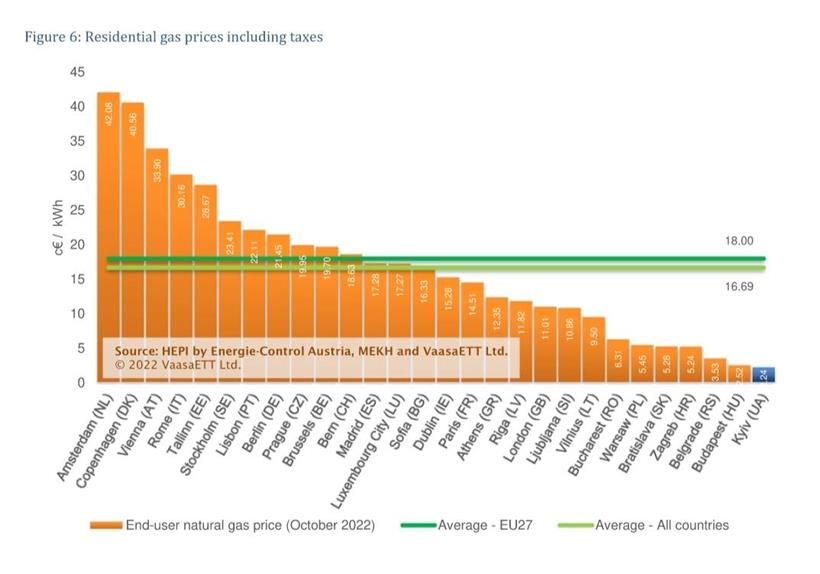 Σε ότι αφορά το φυσικό αέριο για τους οικιακούς καταναλωτές (ΠΙΝΑΚΑΣ 2), η Ελλάδα κατατάσσεται στην 17η θέση, σε σύνολο 28 χωρών, στην τιμή του φυσικού αερίου για τα νοικοκυριά. Η τιμή στην Ελλάδα για τον Οκτώβριο του 2022 διαμορφώθηκε στα 12,35 λεπτά/KWh, χαμηλότερα από τη μέση τιμή της Ε.Ε., η οποία είναι στα 18 λεπτά/KWh. Η Ελλάδα είχε το μεγαλύτερο ποσοστό αποκλιμάκωσης των τιμών του φυσικού αερίου τον Οκτώβριο, σε ποσοστό 55%, σε αντίθεση με τις μεγάλες ευρωπαϊκές χώρες, όπως την Ιταλία και την Πορτογαλία, που σημείωσαν μεγάλες αυξήσεις.