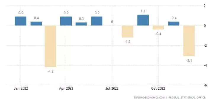 Ραγδαία μείωση κατά 3,1% σημείωσε η βιομηχανική παραγωγή στη Γερμανία τον Δεκέμβριο του 2022, σε μηνιαία βάση, μετά από μια ανοδικά αναθεωρημένη άνοδο 0,4% τον Νοέμβριο και χειρότερη από τις προβλέψεις της αγοράς για πτώση 0,7%.