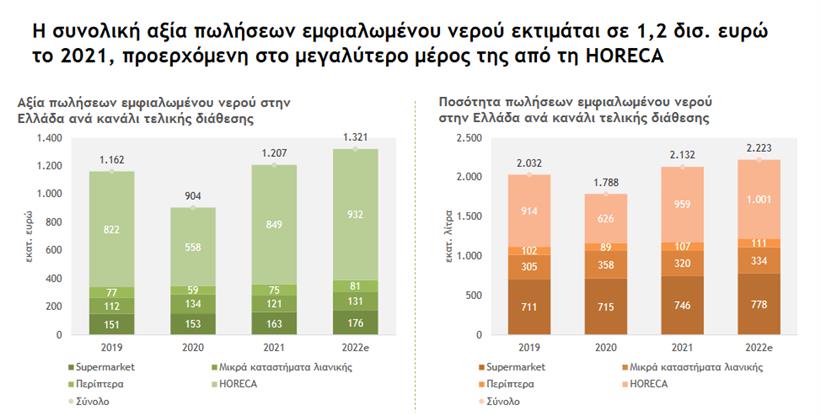 Την περσινή χρονιά οι πωλούμενες ποσότητες εμφιαλωμένου νερού ανήλθαν σε 2.247 εκατ. λίτρα κατά 4,2% αυξημένες σε σχέση με το 2021.