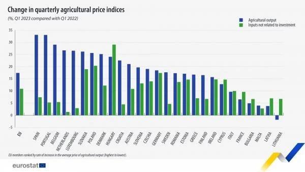 Στην Ελλάδα, η αύξηση του κόστους εισροών (το κόστος παραγωγής των αγροτικών προϊόντων) επιβραδύνθηκε σημαντικά στο 7% από 24% στο δ’ τρίμηνο του 2022, ενώ στην ΕΕ υποχώρησε επίσης απότομα στο 11% από 27%.