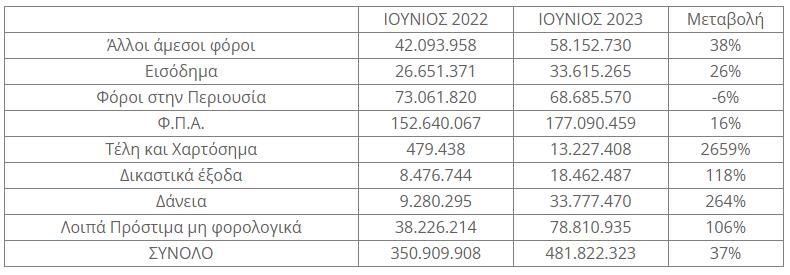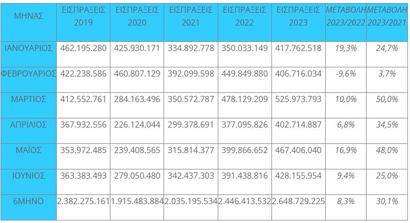 Για το 6μηνο, οι συνολικές εισπράξεις έναντι νέου ληξιπρόθεσμου (εκτός 10 ΜΦΚ) έφτασαν τα 959 εκ. €, ενώ την ίδια περίοδο το 2022 είχαν φτάσει τα 935 εκ. € (οριακή αύξηση 2,6%).
