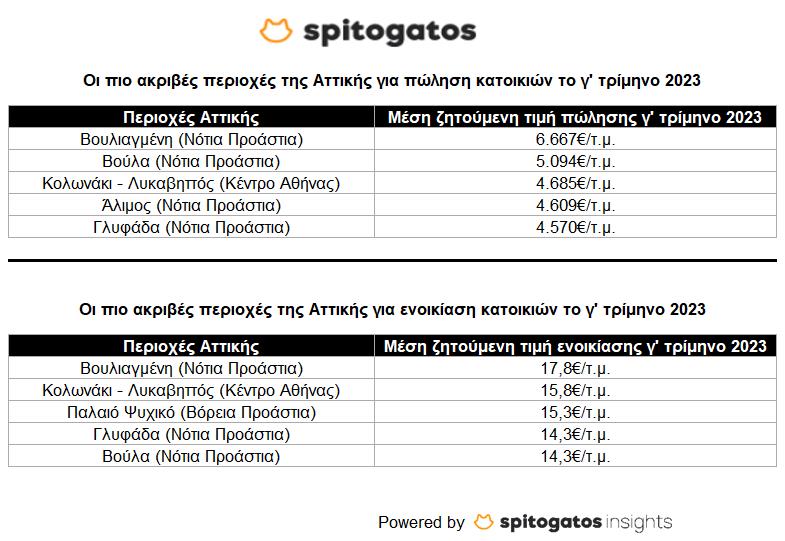 Η ανοδική τάση των τιμών ως προς τις κατοικίες που διατίθενται προς πώληση και ενοικίαση συνεχίζεται και το τρίτο τρίμηνο του 2023, συγκριτικά με το αντίστοιχο διάστημα του 2022. Κάποιες από τις περιοχές που παρουσίασαν τις μεγαλύτερες αυξήσεις στις μέσες ζητούμενες τιμές πώλησης κατοικιών σε σχέση με πέρσι είναι η Πεύκη (Βόρεια Προάστια) με αύξηση +34%, το Μοσχάτο (Προάστια Πειραιά) με αύξηση +27% και η Αγία Παρασκευή (Βόρεια Προάστια) με αύξηση +25%.