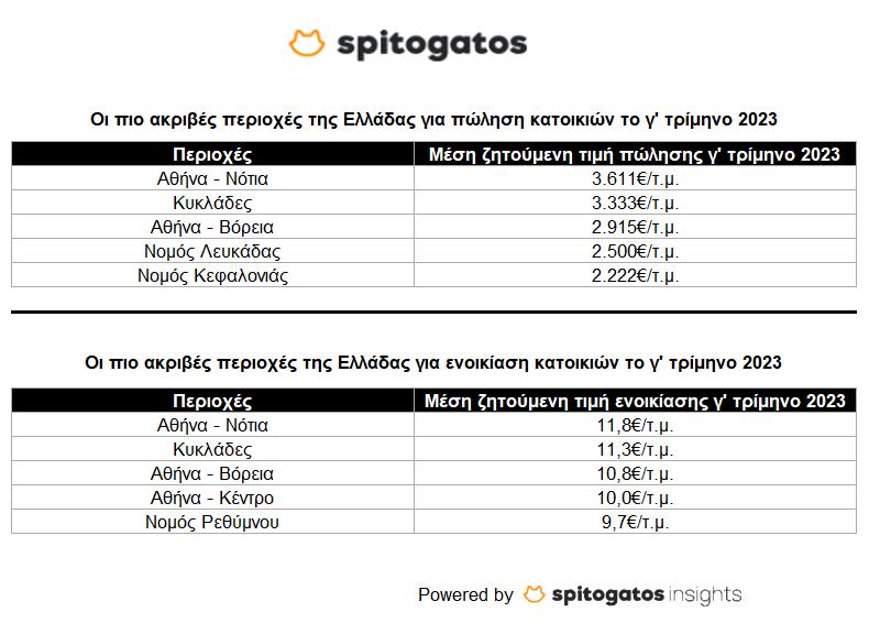 Κάποιες από τις μεγαλύτερες αυξήσεις στη μέση ζητούμενη τιμή πώλησης κατοικιών το τρίτο τρίμηνο του 2023 σε σχέση με το αντίστοιχο διάστημα του προηγούμενου έτους σημειώθηκαν στα Προάστια Πειραιά (+23%), στο Δήμο Θεσσαλονίκης (+21%) καθώς και τα Δυτικά Προάστια Αττικής (+19%). Όσον αφορά την ενοικίαση κατοικιών, οι υψηλότερες μέσες ζητούμενες τιμές καταγράφηκαν στα Νότια Προάστια Αττικής (11,8€/τ.μ.), τις Κυκλάδες (11,3€/τ.μ.) και τα Βόρεια Προάστια Αττικής (10,8€/τ.μ.).