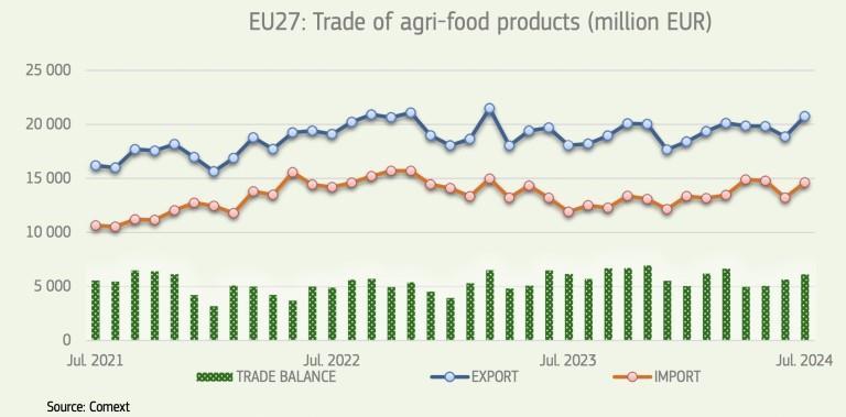 Μεταξύ Ιανουαρίου και Ιουλίου 2024, το εμπορικό πλεόνασμα της ΕΕ στον τομέα των γεωργικών προϊόντων διατροφής ανήλθε σε 39,7 δισ. ευρώ, 1,1 δισ. ευρώ περισσότερο από ό,τι την ίδια περίοδο του 2023.