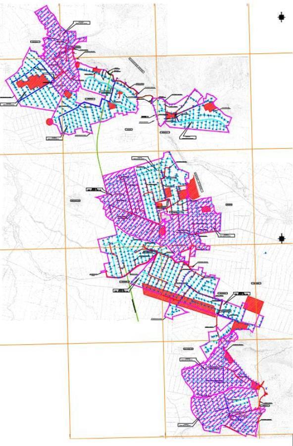 • κεντρικό προσαγωγό, πρωτεύον και δευτερεύον αρδευτικό δίκτυο (δίκτυα διανομής),