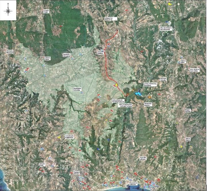 • Κεντρικούς αγωγούς μεταφοράς και διανομής νερού, πέντε (5) αντλιοστάσια και επτά (7) αναρρυθμιστικές δεξαμενές