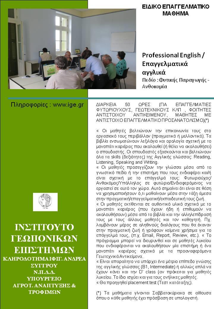 Το μάθημα ΕΠΑΓΓΕΛΜΑΤΙΚΑ ΑΓΓΛΙΚΑ -ΠΕΔΙΟ ΦΥΤΙΚΗΣ ΠΑΡΑΓΩΓΗΣ/ΑΝΘΟΚΟΜΙΑ , απευθύνεται σε επαγγελματίες φυτωριούχους, γεωτεχνικούς, κλπ.