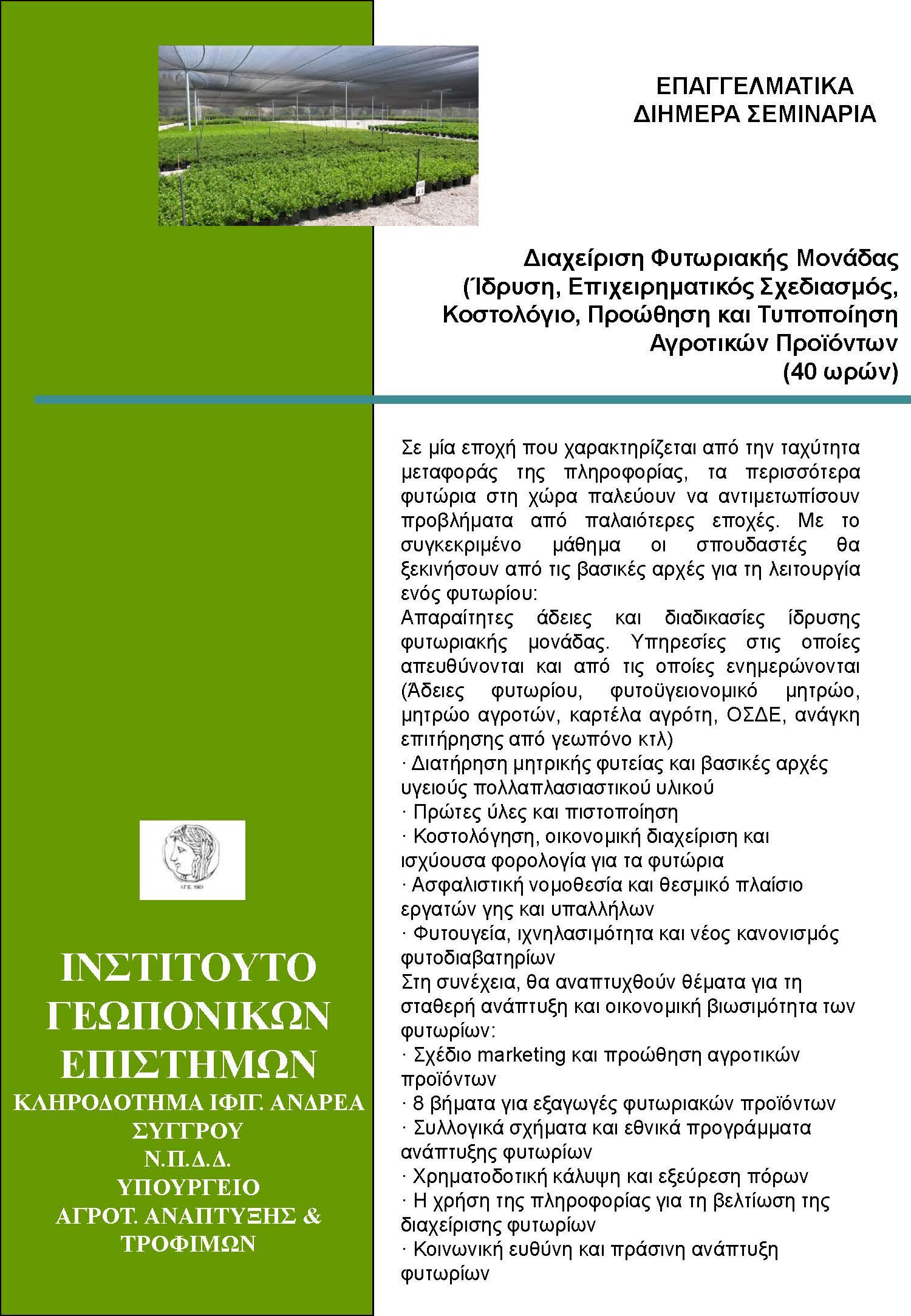 Με τις αλλαγές που έχουν γίνει στους κανονισμούς φυτοϋγείας και το διεθνές εμπόριο, οι 2 αυτοί κύκλοι μαθημάτων έρχονται να δώσουν γνώση και εξειδίκευση στο Φυτωριακό Κλάδο για να έχει προοπτική στο νέο εμπορικό εγχώριο και διεθνές περιβάλλον.