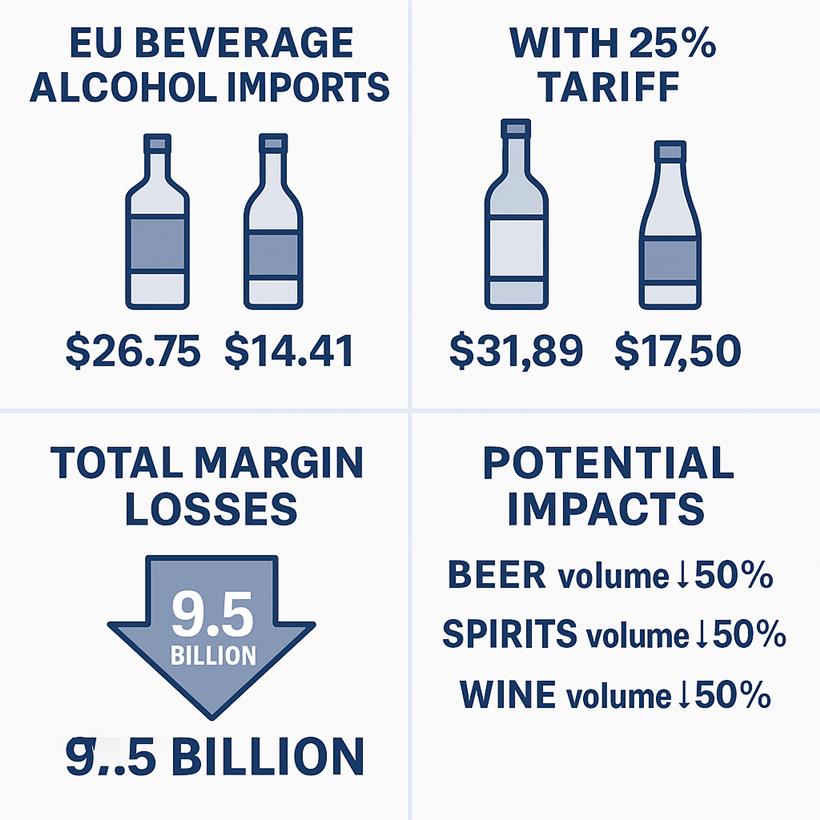 Το 2024, η τελωνειακή αξία των εισαγωγών από την Ε.Ε. έφτασε τα 10 δισ. δολάρια. Ολόκληρη η αλυσίδα διανομής – από τον εισαγωγέα μέχρι τον μπάρμαν – αποκόμισε περιθώρια κέρδους της τάξης των 23,8 δισ. δολαρίων, με την τελική καταναλωτική δαπάνη να εκτινάσσεται στα 36,3 δισ.