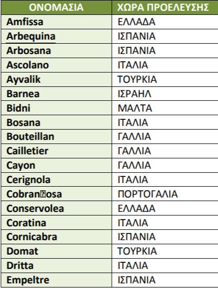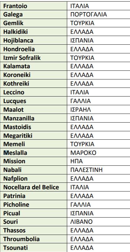Στον Πίνακα 1 φαίνονται μερικά από τα είδη ελαιών 7 :