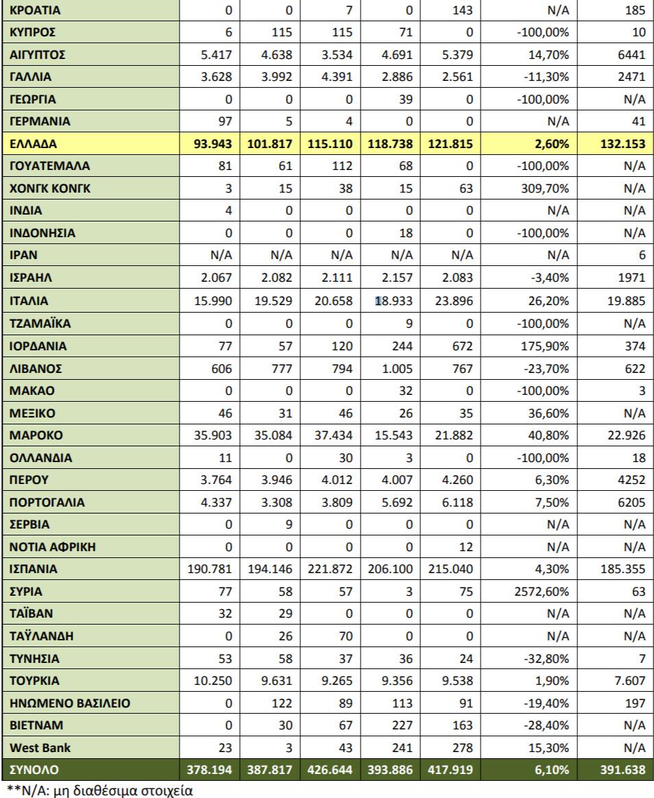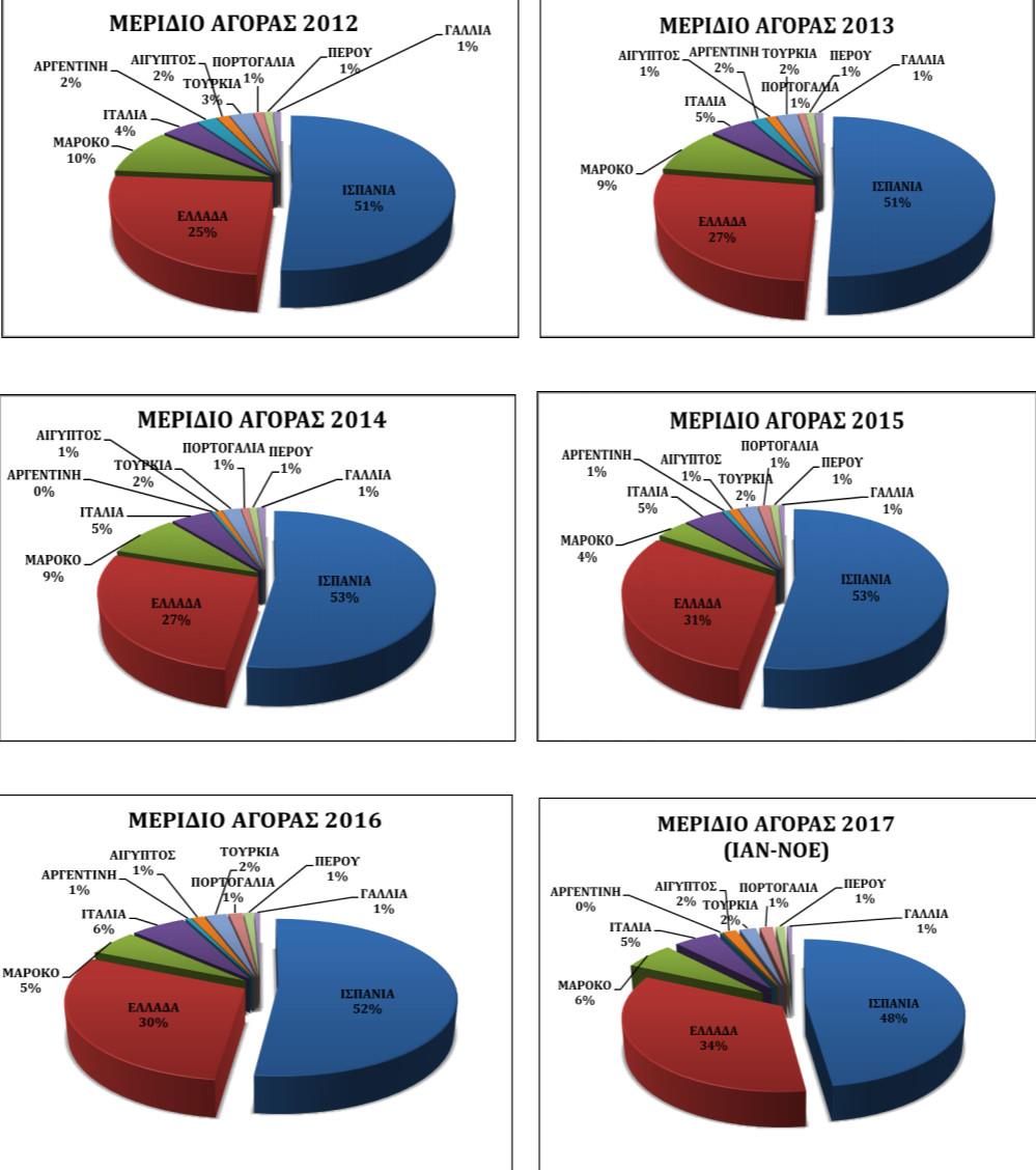 Στα διαγράμματα που ακολουθούν απεικονίζεται το μερίδιο αγοράς ανά έτος και ανά χώρα προμηθευτή για τις δέκα πρώτες χώρες εξαγωγείς.Στον Πίνακα 4 αναγράφεται η αξία καθώς και το μερίδιο αγοράς των εισαγωγών επιτραπέζιων ελαιών στις ΗΠΑ, ανά κωδικό, για όλες τις χώρες-εξαγωγείς.