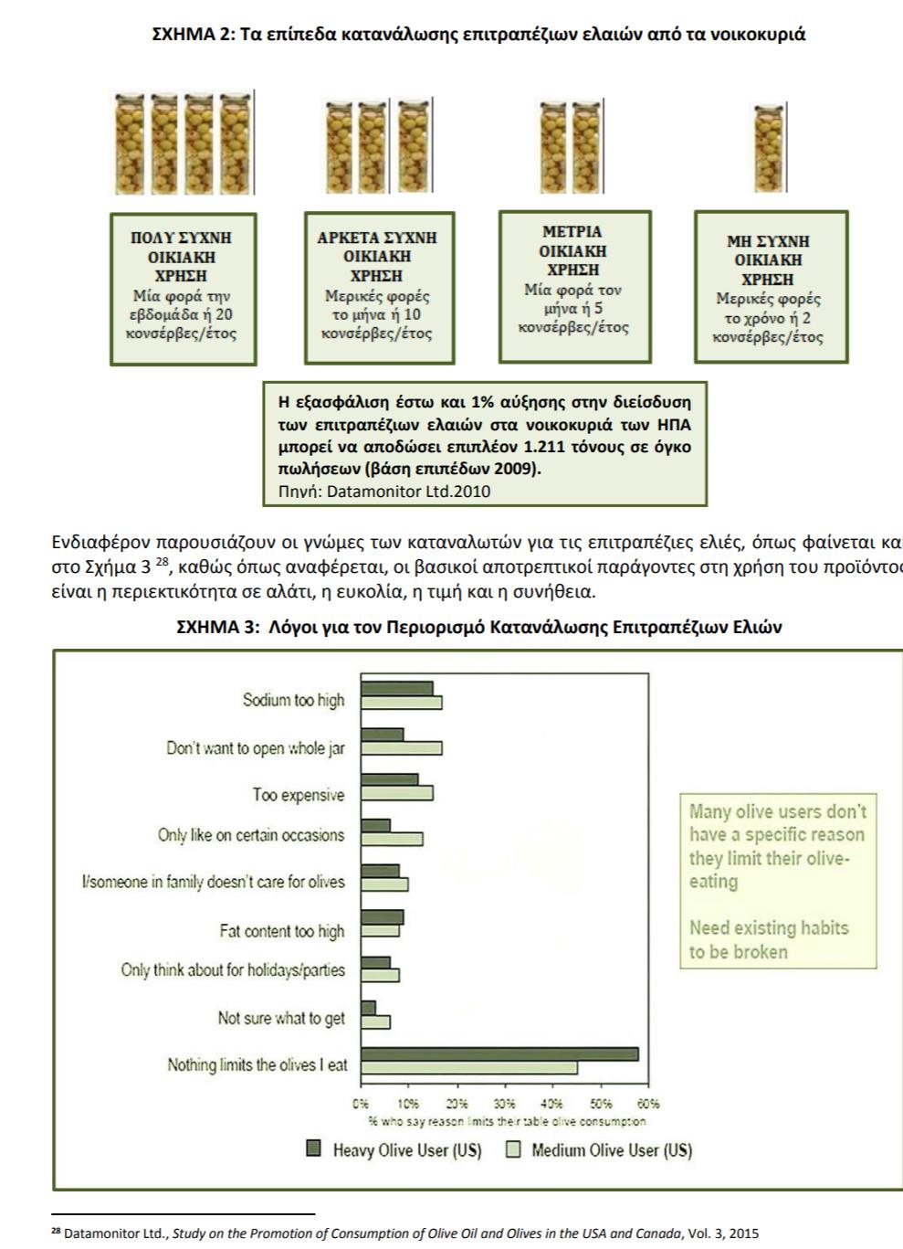 Ως εκ τούτου, ο συνδυασμός υψηλών επιπέδων αλατιού και λιπαρών (τα λιπαρά που περιέχονται στις ελιές κυμαίνονται από 75%‐90%) αποτρέπει την εκτεταμένη κατανάλωση των επιτραπέζιων ελαιών, παρόλο που το 75% των οικιακών καταναλωτών θεωρούν ότι οι ελιές είναι υγιεινές. Επιπλέον, οι καταναλωτές στις ΗΠΑ προτιμούν τα γρήγορα σνακς, με δημοφιλέστερα το τυρί σε συσκευασμένα κομμάτια και τα πατατάκια, ενώ τα γεύματα τους στο σπίτι είναι λιγότερα.