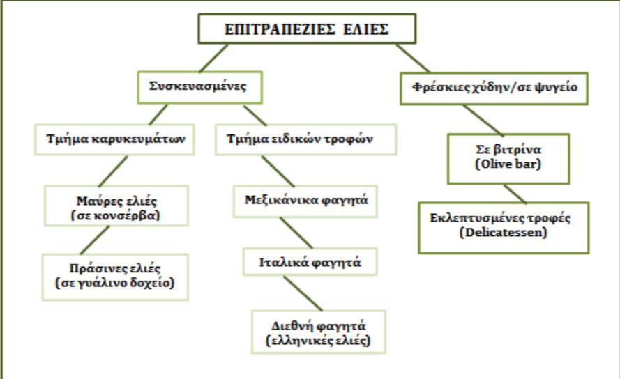 Η πώληση των ελαιών κατά αυτό τον τρόπο έγινε δημοφιλής, με αποτέλεσμα το 26% πλέον των υπεραγορών (από 18% το 2006) να διαθέτουν τις ελιές χύδην. Εν τούτοις, παρά τις σχετικές προωθητικές δράσεις, οι πωλήσεις του προϊόντος παρουσιάζουν μείωση, όπως ήδη έχει λεχθεί. Το γεγονός αυτό οφείλεται στη χαμηλή διείσδυση του προϊόντος στο καταναλωτικό κοινό, καθώς η ανάδειξη των ελαιών σε εκλεκτό προϊόν οδήγησε στην κατανάλωσή του από πιο εύπορους καταναλωτές,που είναι διατεθειμένοι να πληρώσουν περισσότερο για ένα καλύτερης ποιότητας προϊόν από αυτό που, κατά την αντίληψή τους, περιέχεται σε ένα γυάλινο δοχείο ή μια κονσέρβα .