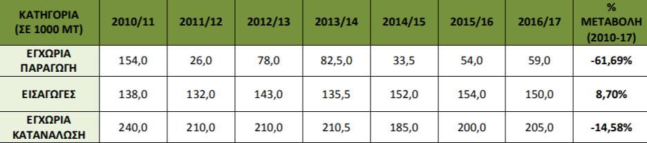 ΠΙΝΑΚΑΣ 2: Εγχώρια Παραγωγή και Κατανάλωση Επιτραπέζιων Ελιών στις ΗΠΑ