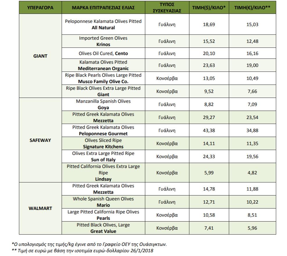 Ύστερα από τιμοληψία του προϊόντος σε τρεις διαφορετικής κλίμακας ποιότητας και τιμών υπεραγορές (super markets) της μητροπολιτικής περιοχής της Ουάσιγκτον καταγράφηκαν οι κάτωθι τιμές λιανικής πώλησης της επιτραπέζιας ελιάς όπως φαίνεται και στον Πίνακα 3 παρακάτω: