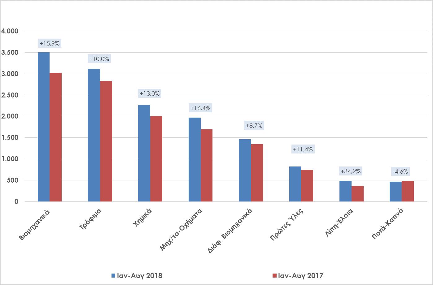 Η σημαντική ενίσχυση των εξαγωγών για το διάστημα Ιανουάριος-Αύγουστος 2018 οφείλεται στην επιμέρους αύξηση των περισσότερων εξαγωγικών κλάδων της ελληνικής οικονομίας. Όπως προκύπτει από τα στοιχεία της ΕΛΣΤΑΤ και παρουσιάζεται στον Πίνακα 2, σημαντική αύξηση παρουσίασαν οι κλάδοι των βιομηχανικών προϊόντων (€481,3 εκατ., ήτοι 15,9%), τα τρόφιμα (€283,6 εκατ., ήτοι 10,0%), τα χημικά (€260,1 εκατ., ήτοι 13,0%), τα μηχανήματα-οχήματα (€276,8 εκατ., ήτοι 16,4%), τα διάφορα βιομηχανικά προϊόντα (€116,3 εκατ., ήτοι 8,7%), οι πρώτες ύλες (€84,4 εκατ., ήτοι 11,4%) και τα λίπη και έλαια (€124,1 εκατ., ήτοι 34,2%). Τα ποτά και καπνά ήταν ο μοναδικός κλάδος όπου σημειώθηκε μείωση των εξαγωγών η οποία ανήλθε σε €22,4 εκατ., δηλαδή 4,6%.